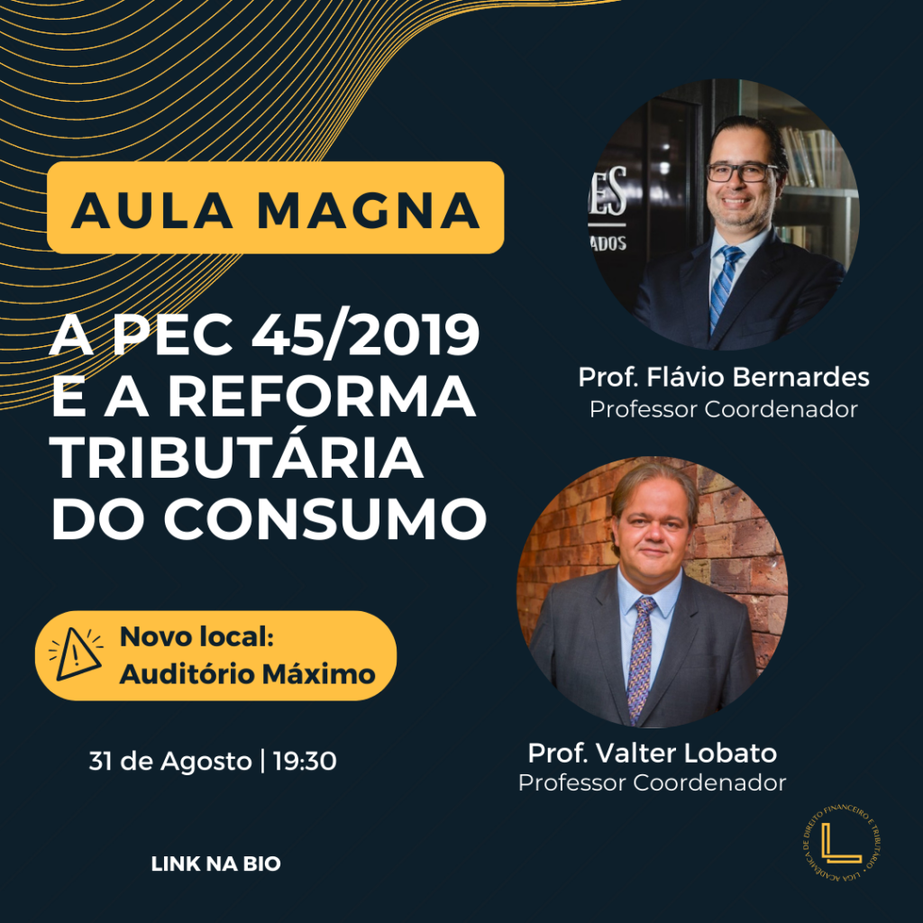 Na quinta-feira, dia 31.08, os Professores Flávio Bernardes e Valter Lobato, coordenadores da LAFT, ministrarão uma Aula Magna, abordando a temática da Reforma Tributária.