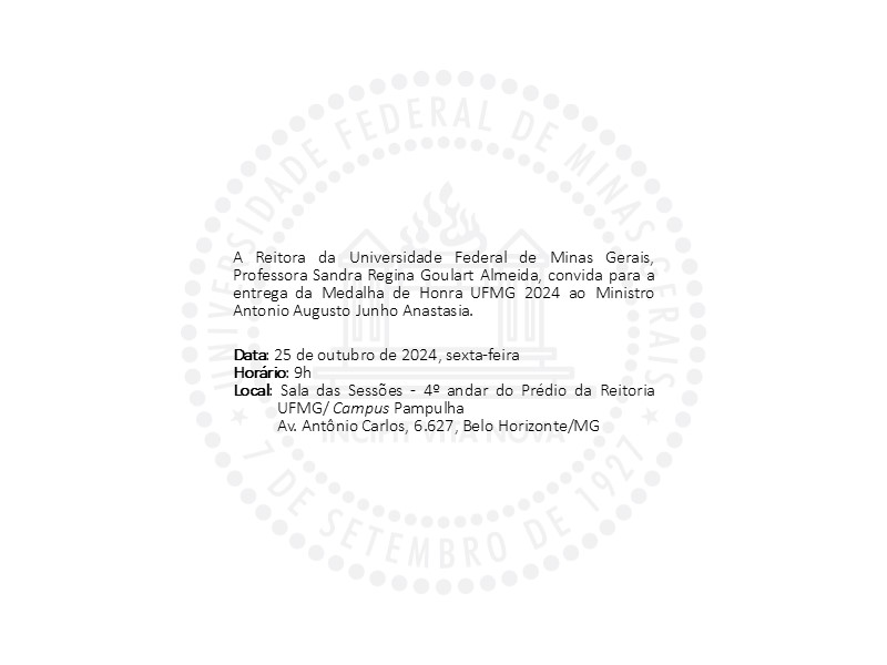 DIVULGAÇÃO: Convite – Entrega da Medalha de Honra UFMG 2024 ao Ministro Antonio Augusto Junho Anastasia Postado por ATI em 11/out/2024 Postado por ATI em 11/out/2024