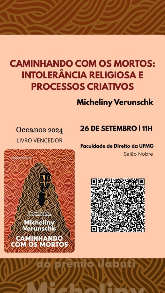 A Faculdade de Direito receberá no dia 26 de setembro, às 11h, a escritora multipremiada Micheliny Verunschk para uma discussão sobre o seu livro “Caminhando com os mortos”, que trata sobre a questão da radicalização e da intolerância religiosa. A autora estará com a Profa. Camila Nicácio, que, com o seu Grupo de pesquisa em Antropologia do direito (Dom), pesquisa, dentre outros temas, a interface entre direito e religião, e o Prof. Marcelo Galuppo, com o seu grupo de Pesquisa em Direito e Literatura Sapientia.