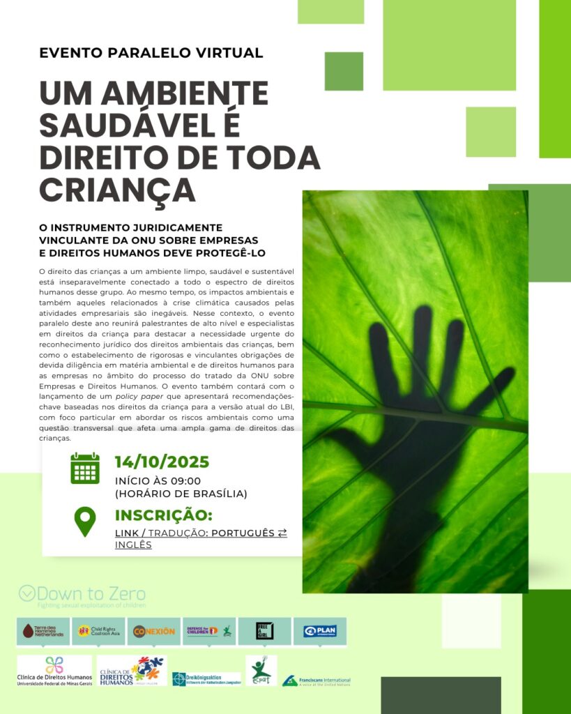 O direito das crianças a um ambiente limpo, saudável e sustentável é indissociável do conjunto completo dos seus direitos humanos. No entanto, os impactos ambientais e climáticos das atividades empresariais continuam a colocar esses direitos em risco. Participe do nosso evento paralelo para ouvir palestrantes de alto nível e especialistas em direitos da criança sobre a necessidade urgente de reconhecimento legal dos direitos ambientais das crianças e de obrigações vinculativas de due diligence ambiental e de direitos humanos no âmbito do processo do Tratado das Nações Unidas sobre Empresas e Direitos Humanos. O evento também lançará um novo documento de política com recomendações fundamentais baseadas nos direitos da criança para a versão atual do LBI, com forte enfoque nos riscos ambientais como uma questão transversal.