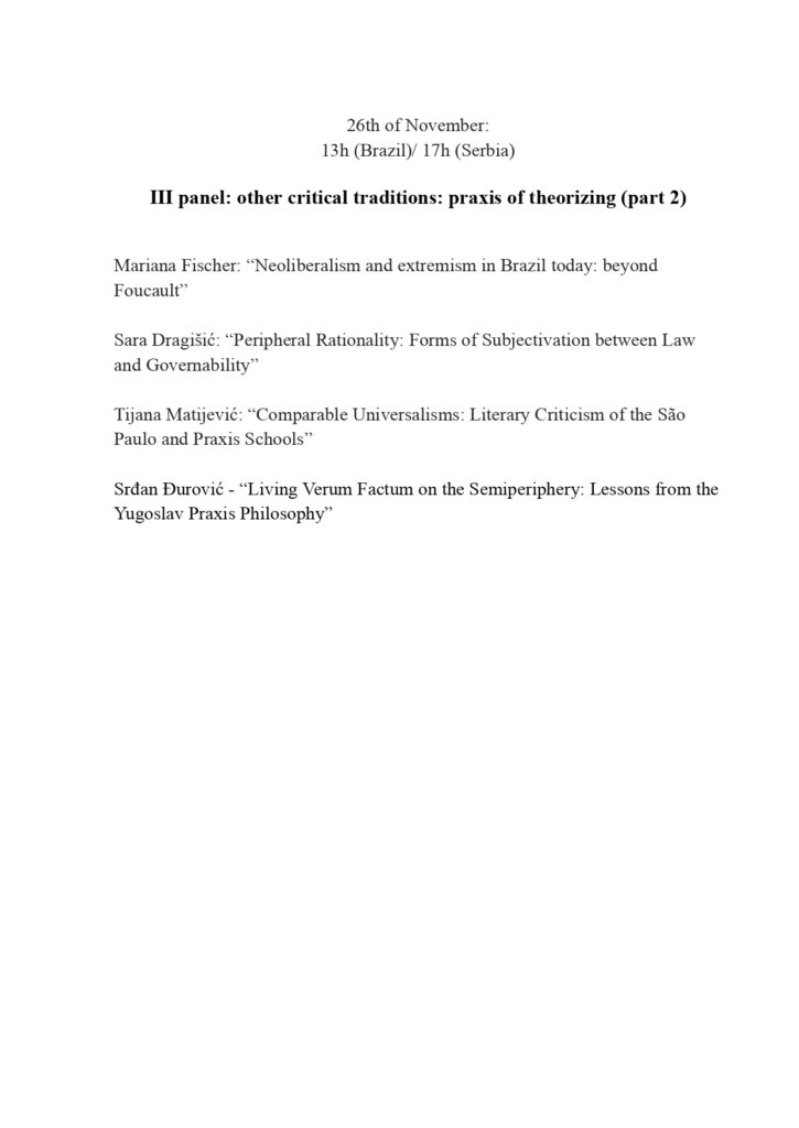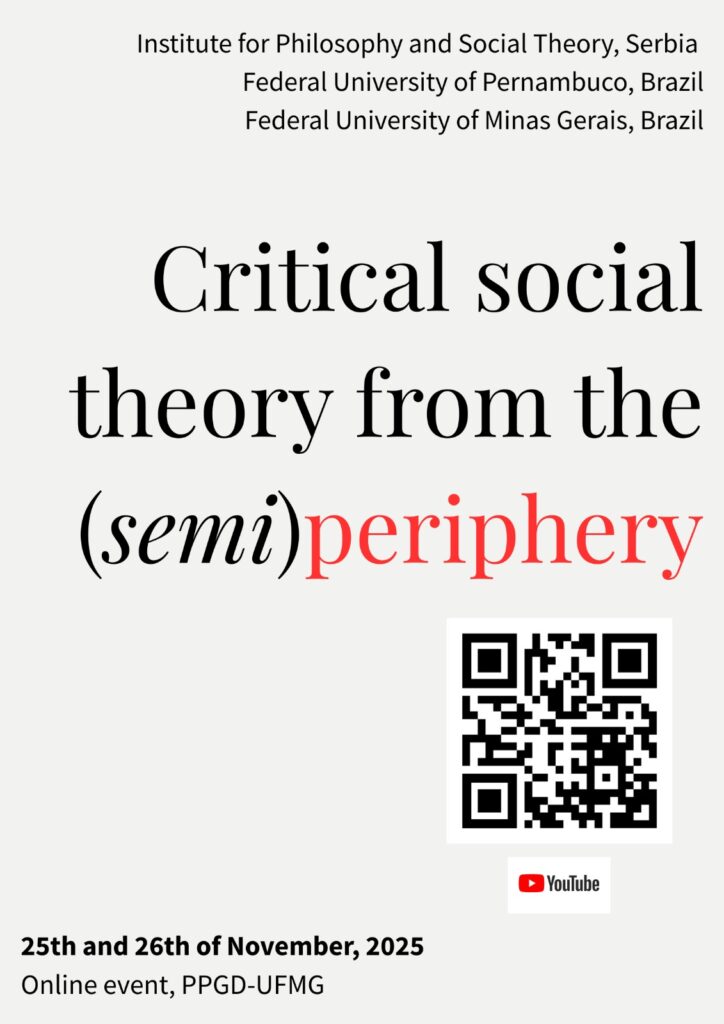 Nos dias 25 e 26 de novembro de 2025, acontecerá o seminário Critical Social Theory From The (Semi)Periphery, reunindo intelectuais do Brasil e da Sérvia. O evento tem como objetivo desenvolver uma reflexão conjunta e polifônica sobre a teoria social crítica quando pensada fora do centro global. Para tanto, leva em consideração diferenças internas à periferia, colocando em debate a possibilidade de se falar em uma semiperiferia – o que, por sua vez, justificaria a aproximação entre os pontos de vista de Brasil e Sérvia. Como representantes do Brasil, teremos a participação da professora Mariana Fischer, da UFPE, e dos professores do PPGD-UFMG, David F. L. Gomes e Gabriel Rezende. Representando a Sérvia, participam Andrea Perunović, Marjan Ivković, Milan Urošević, Sara Dragišić, Srđan Đurović, e Tijana Matijević, ligadas e ligados ao Instituto de Filosofia e Teoria Social da Universidade de Belgrado, além de Vanja Grujic, vinculada à UFPE. O evento será totalmente on-line, com transmissão no canal do PPGD no YouTube! O cartaz de divulgação e a programação seguem em anexo.