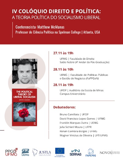 Nos dias 27 e 28 de novembro de 2025, acontecerá o IV Colóquio Direito e Política, por meio de uma articulação interinstitucional entre a UEMG, a UFOP e o PPGD-UFMG, representadas respectivamente pelos professores Franklin Dutra, Bruno Camilloto e David F. L. Gomes. Neste ano, o evento receberá o professor Mathew McManus, da Spelman College (Atlanta, Estados Unidos), que discutirá seu livro The Political Theory of Liberal Socialism, lançado recentemente. Além dos professores organizadores do IV Colóquio, também participarão debatendo com o professor McManus a professora Julia Moura, da UFPR, o professor Wagner Oliveira, da UFT e em residência pós-doutoral junto ao PPGD-UFMG, e o discente do PPGD-UFMG Renan Borges. No dia 27, a conferência de abertura terá lugar na Faculdade de Direito da UFMG, às 19:00. No dia 28, às 10:00 da manhã, as atividades continuam na Faculdade de Políticas Públicas e Gestão de Negócios da UEMG, em Belo Horizonte, e encerram-se às 19:00 em Ouro Preto, na Escola de Minas. As inscrições podem ser feitas neste link: https://www.even3.com.br/iv-coloquio-direito-e-politica-a-teoria-politica-do-socialismo-liberal-654761/