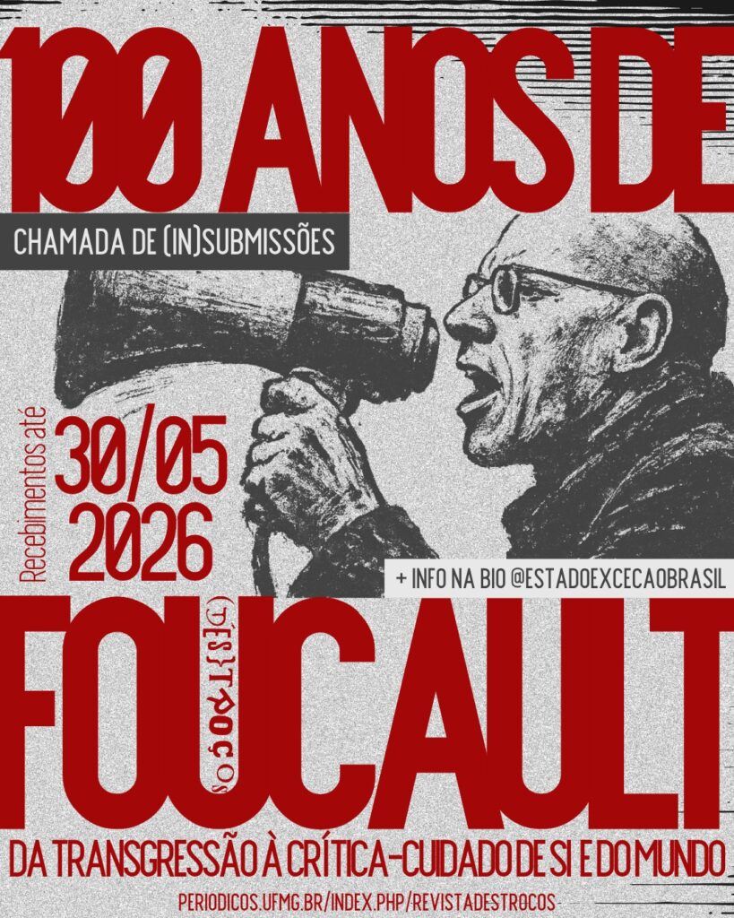 Estamos recebendo contribuições para o Dossiê intitulado “100 anos de Michel Foucault: da transgressão à crítica-cuidado de si e do mundo”, organizado em parceria com Vanja Grujić e Milan Urošević. Em celebração ao centenário do nascimento de Foucault, a chamada convida a refletir sobre a força irruptiva da crítica como método e gesto ético-político, bem como sobre seus desdobramentos na transgressão e no cuidado de si e do mundo.