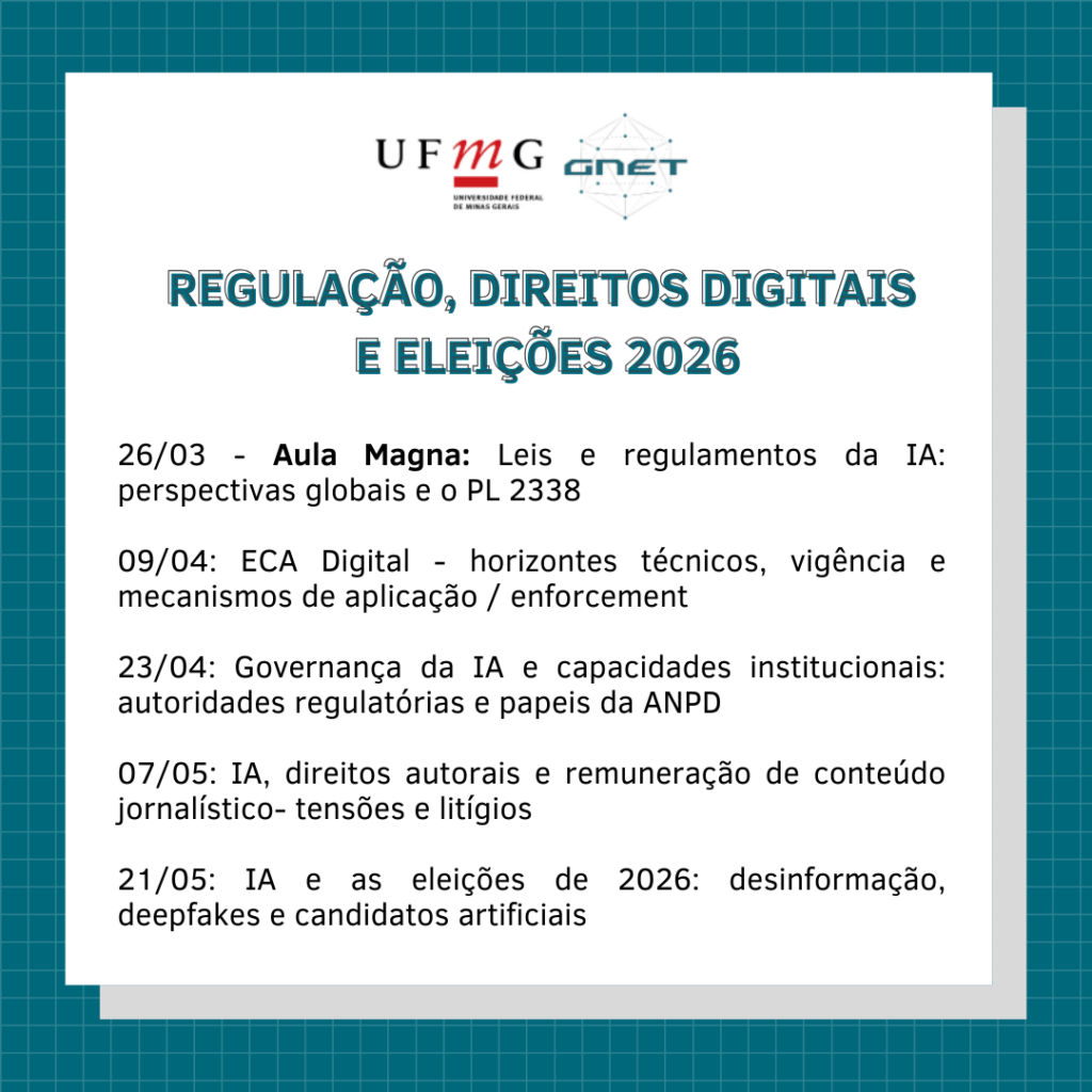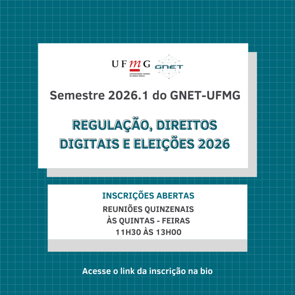 É com muita alegria que comunicamos a abertura das inscrições para o GNet no semestre de 2026/1. O grupo dedicará sua atenção ao envolvente tema “Regulação, direitos digitais e eleições 2026“.