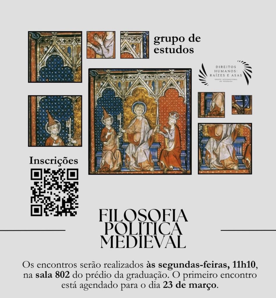 O Grupo Internacional de Pesquisa “Direitos Humanos: Raízes e Asas”, coordenado pela Profª. Drª. Karine Salgado, convida toda a comunidade acadêmica para os encontros do Grupo de Estudos de Filosofia Política Medieval.