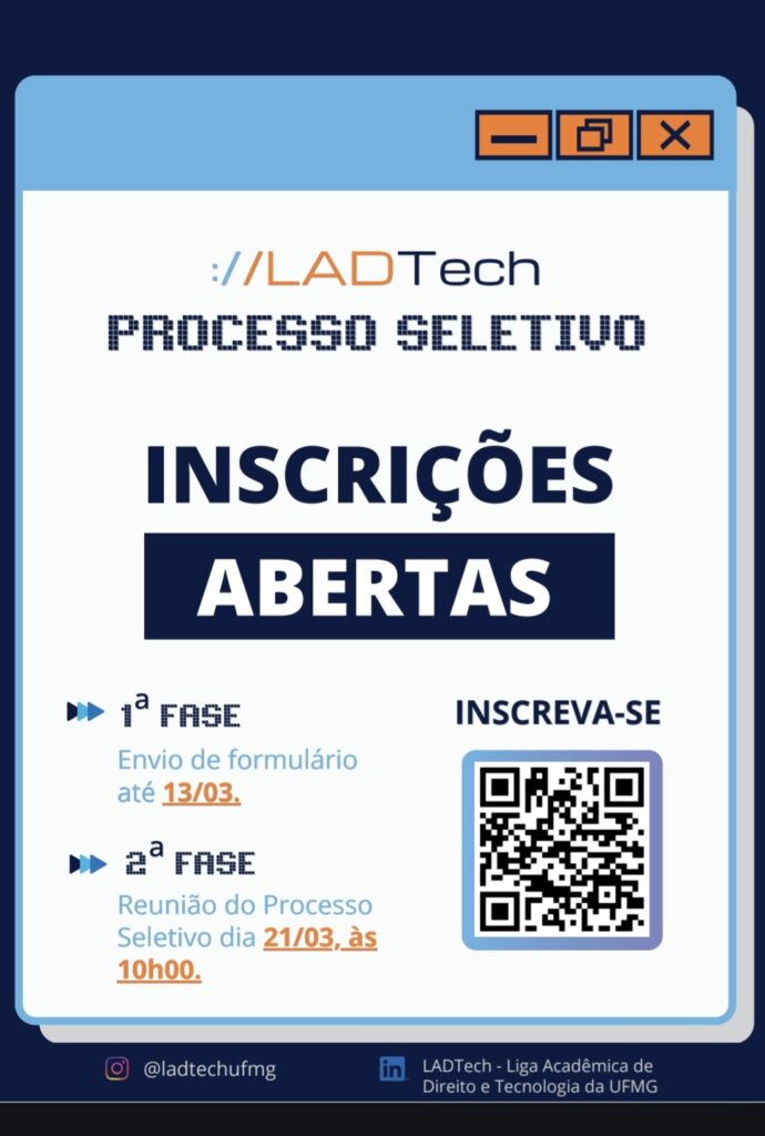 Estão abertas as inscrições para o processo seletivo da Liga Acadêmica de Direito e Tecnologia da UFMG – LADTech.
