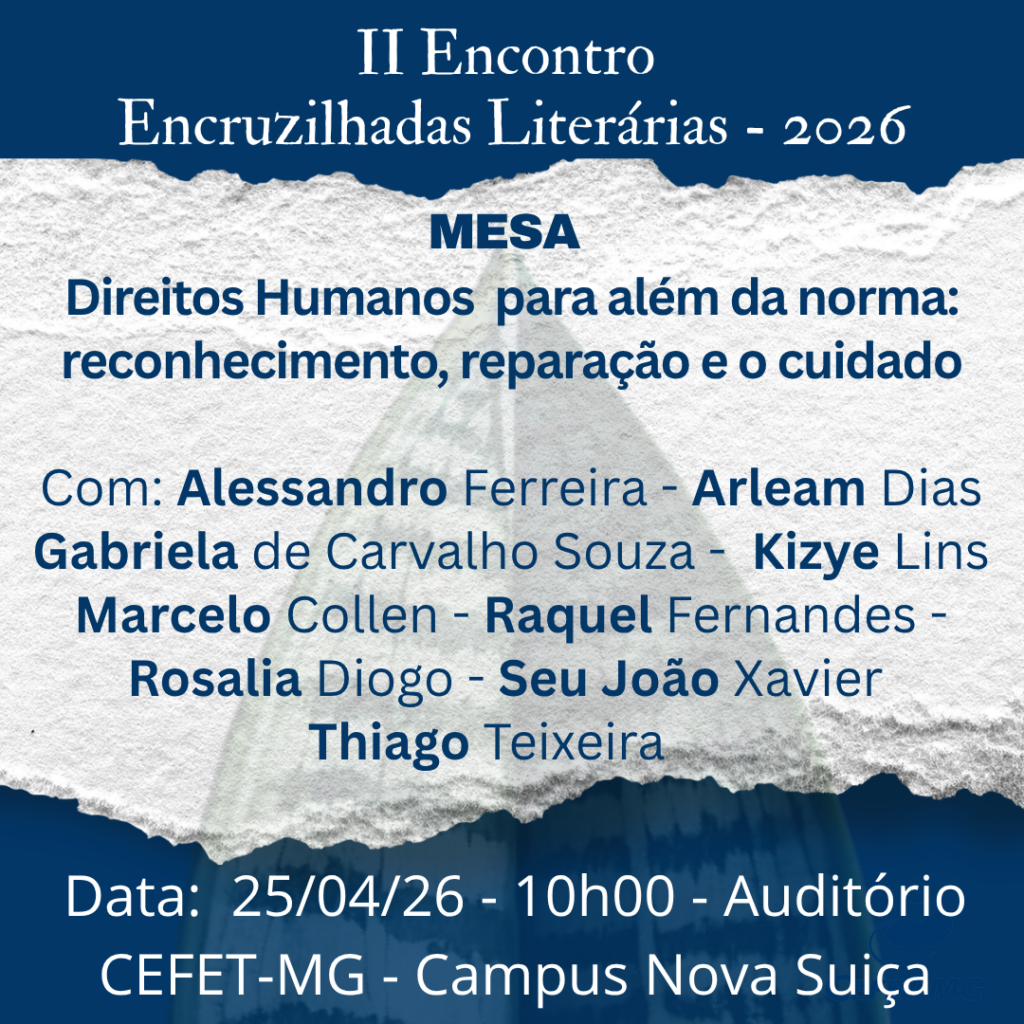 O Grupo de Estudos Críticos para as Relações Étnico-raciais (GECRE/CNPq), em parceria com o Centro Federal de Educação Tecnológica de Minas Gerais (CEFET-MG), convida a comunidade acadêmica para o II Encontro Encruzilhadas Literárias – 2026, que contará com a mesa temática “Direitos Humanos para além da norma: reconhecimento, reparação e cuidado”.