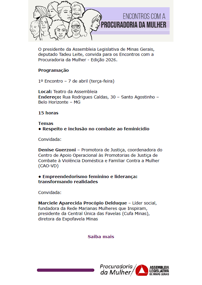 ALMG CONVITE – Encontros com a Procuradoria da Mulher – Edição 2026 Postado por ATI em 26/mar/2026 https://www.almg.gov.br/comunicacao/convites/procuradoria-mulher/procuradoria-da-mulher-1-encontro-2026.html Postado por ATI em 26/mar/2026