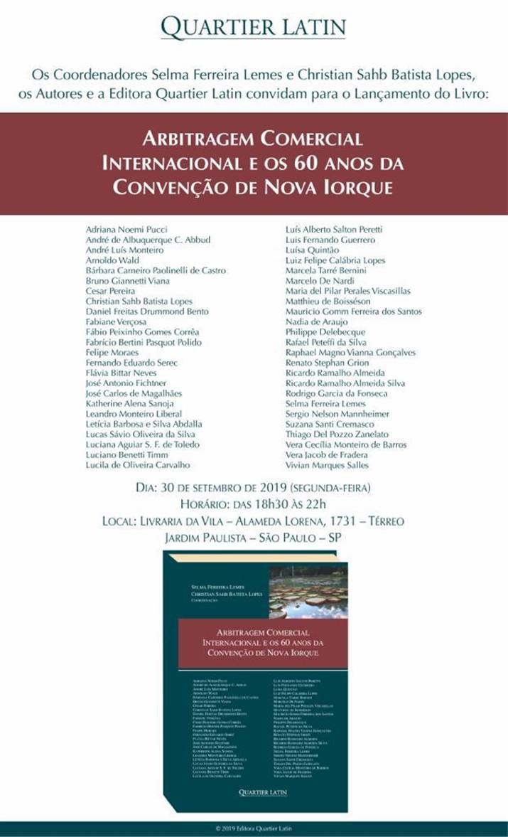 Na próxima segunda-feira (30), acontecerá, na Livraria da Vila, em São Paulo, das 18h30 às 22h, o lançamento do livro “Arbitragem Comercial Internacional e os 60 anos da Convenção de Nova Iorque”. Coordenado pela professora Selma Ferreira Lemes e pelo professor Christian Sahb Batista Lopes, da Faculdade de Direito da UFMG, o livro possui 49 autores, sendo eles arbitralistas brasileiros e estrangeiros.