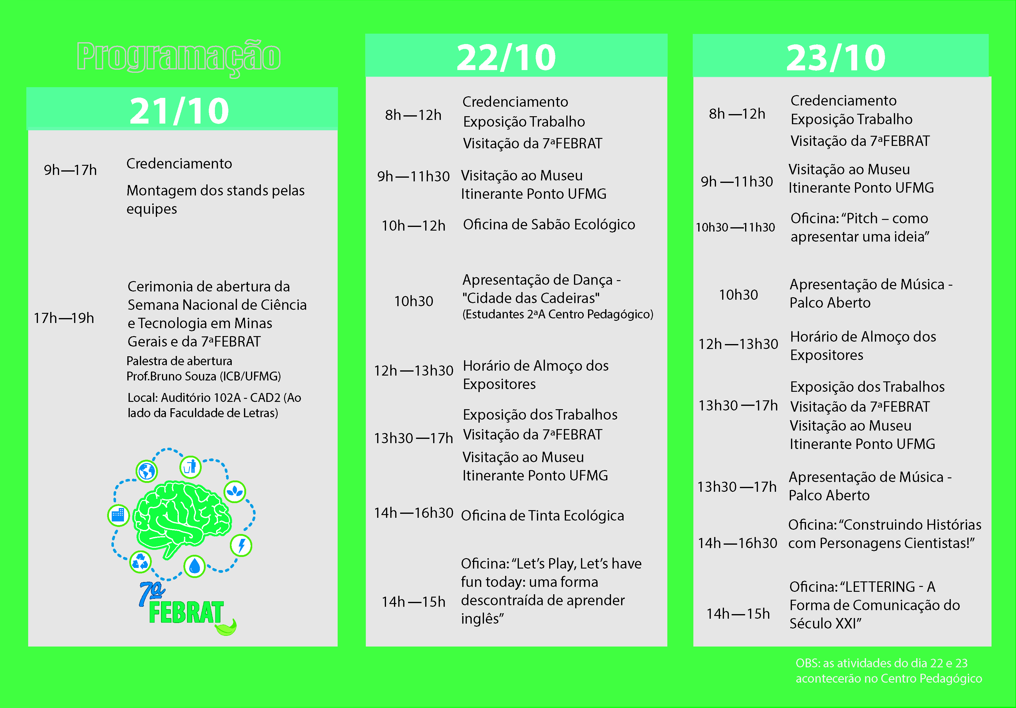 7ª FEBRAT (Feira Brasileira de Colégios de Aplicação e Escolas Técnicas) do Centro Pedagógico – UFMG Postado por ATI em 18/out/2019 Postado por ATI em 18/out/2019